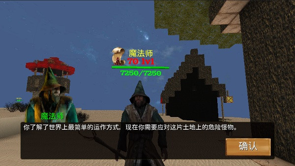在旅程的开篇,我们的主人公被一股神奇的力量强行带到了尘封世界,这里的所有都是由方块组成的,其中包括了主人公自己。就在你为自己的处境感到疑惑之时,一位面容慈祥的魔法师将会作为你的向导给予你孜孜不倦的教诲。他是游戏中玩家见到的第一个NPC,也会伴随你通过所有的教学任务。