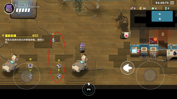 5、当我们拾取武器之后,游戏界面右侧的圆盘即可派上用场了,点击可以发射子弹攻击,滑动可以调整攻击方向;
