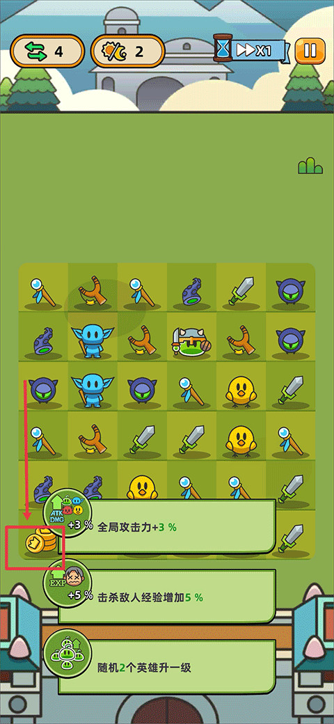 3、地图中还会有金币,玩家可以将他们合成为宝箱,宝箱解锁后会提供三种技能,玩家可以根据自己的需求选择