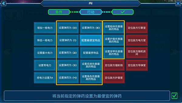 如图,你的导弹室将首先执行5号行动定位攻击敌方护盾,如果敌方护盾失效,导弹室将执行7号行动定位攻击敌方导弹室,如果敌方导弹室也被破坏了,则往下执行8号行动攻击敌方的电力室。