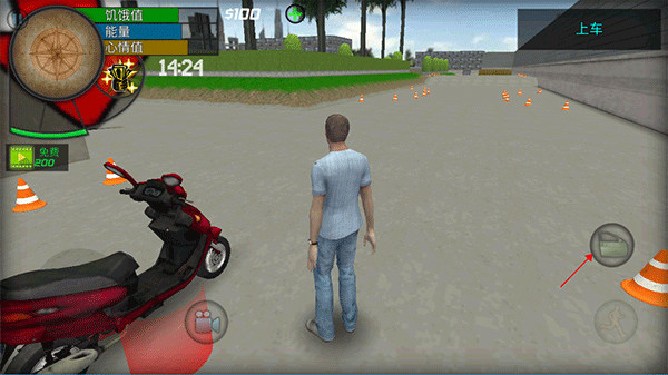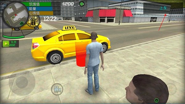 3、右上角是当前的行动提示,先上出租车前往驾校报名,靠近红色区域,点击“车门”即可上车;