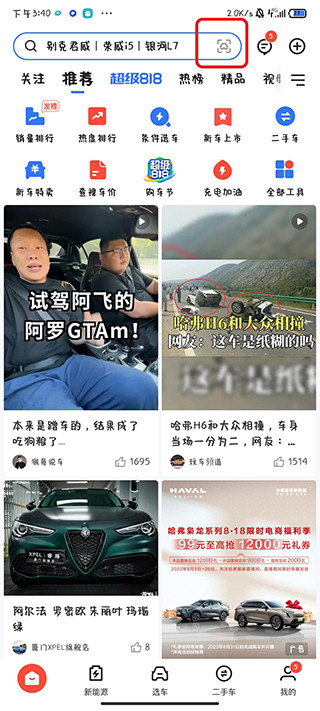 1、打开易车app进入首页,点击屏幕上方搜索栏右侧的“扫一扫”图标;