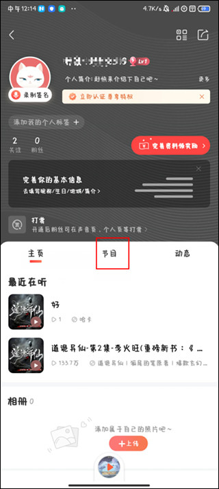2、进入到个人详细信息页面,再点击“节目”选项;