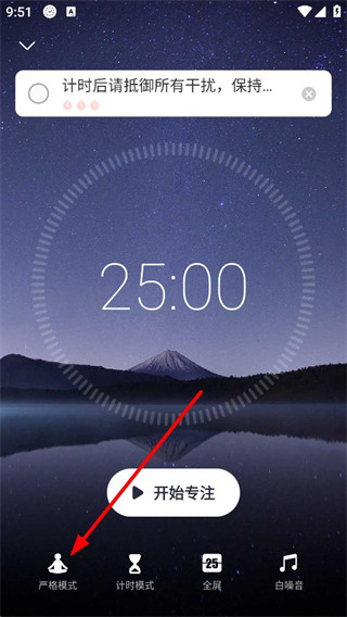 1、进入专注计时主界面,显示计时时长,底部有严格模式等功能选项,点击严格模式,即可进入对应的模式设置操作界面。