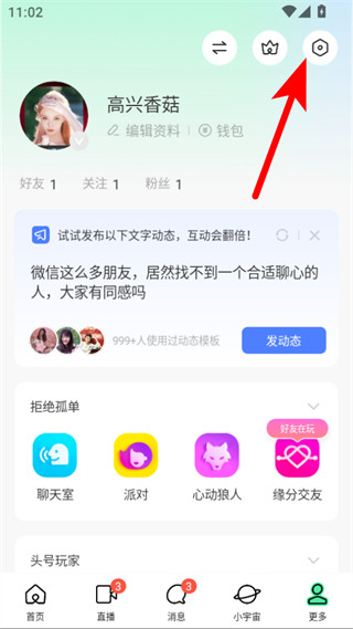 2、在个人页面右上角,点击设置图标,进入设置界面。