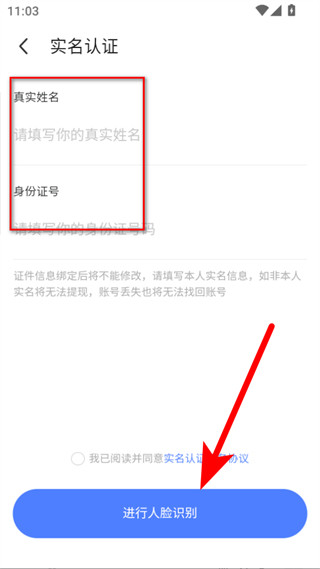 5、在实名认证页面,填写真实姓名和身份证号,勾选同意协议后,点击进行人脸识别,完成人脸识别验证后即可完成实名认证。