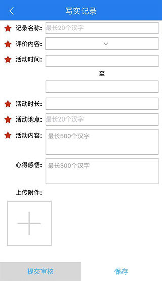 3、输入写实记录内容,上传图片或附件后点击“提交审核”或“保存”。