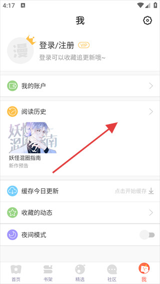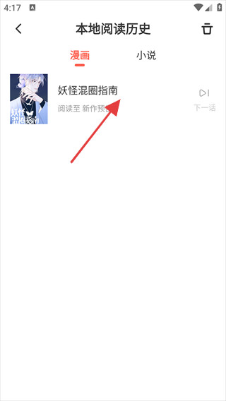 3、进入本地阅读历史页面,可查看漫画和小说的阅读记录,如《妖怪混圈指南》的阅读进度。