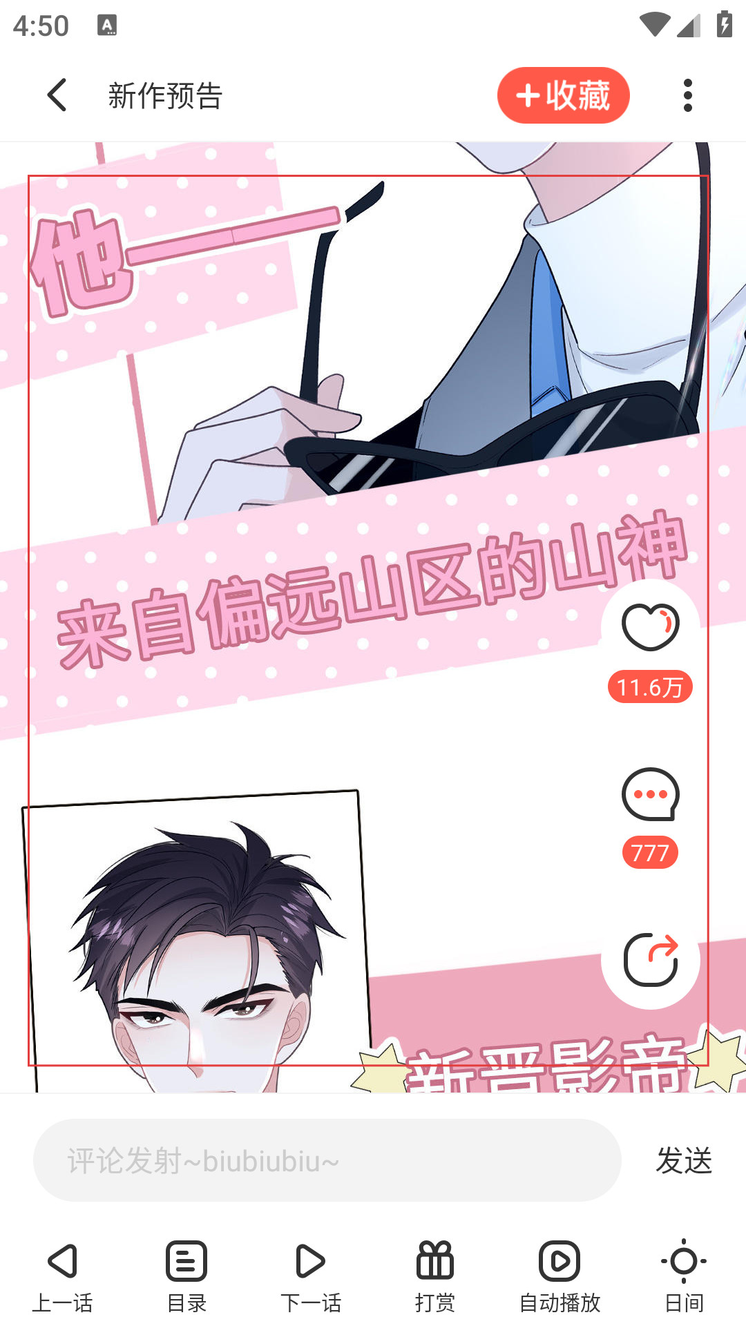 4、点击进入漫画详情页,可查看漫画内容,也可进行【收藏】【评论】【分享】等操作,还能设置【自动播放】【日间模式】等功能。