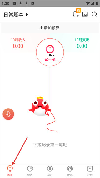 1、首页可查看日常账本收支,支持添加预算、语音记账,有记一笔功能入口,助力用户便捷记录财务收支。