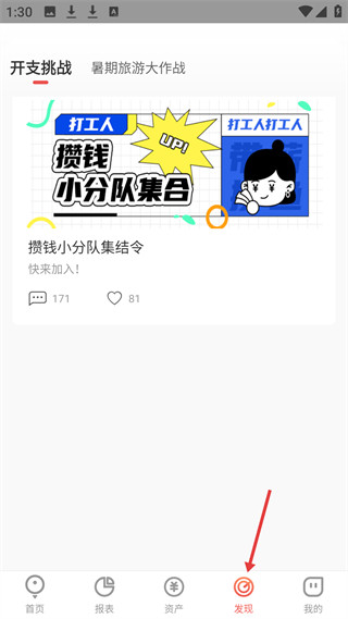 4、发现板块有开支挑战、攒钱小分队等活动,如攒钱小分队集结令,为用户提供攒钱互动与理财灵感。