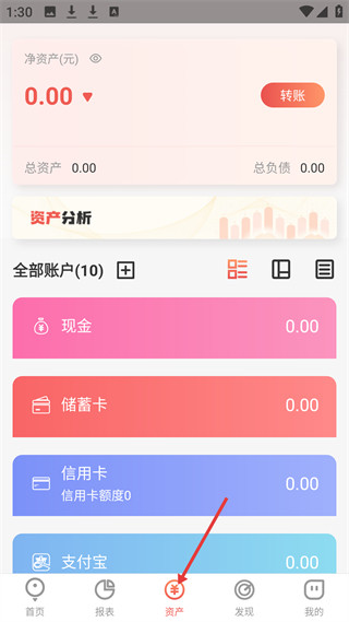 3、资产板块可管理现金、储蓄卡、信用卡、支付宝等账户,展示净资产、总资产与总负债,助力用户统筹资产情况。
