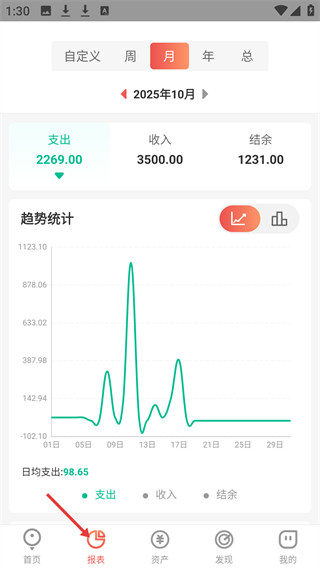 2、报表板块可查看月度收支、结余及趋势统计,通过图表直观呈现财务分布,帮助用户分析财务状况。
